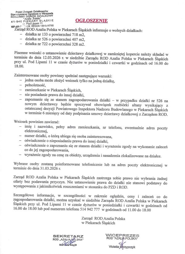W dniu 22.04.2024 r. na Walnym zebraniu sprawozdawczo-wyborczym wybrano nowy Zarząd ROD Azalia Polska w składzie:
