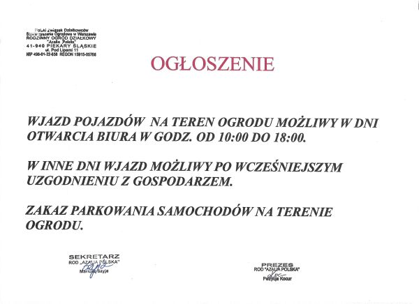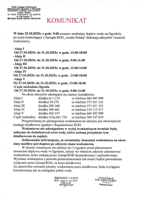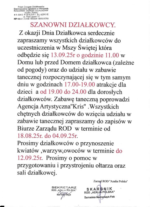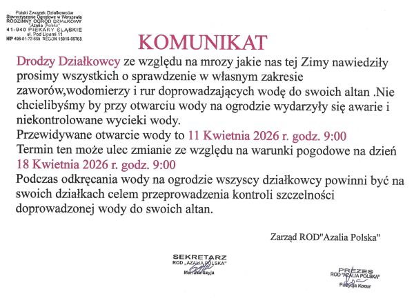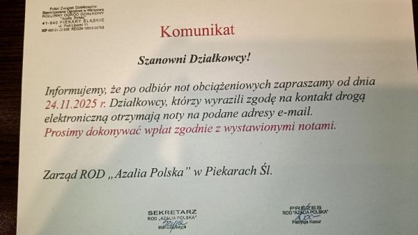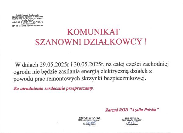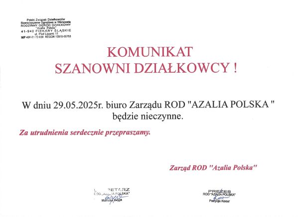 W dniach 15.04 oraz 02.05 biuro Zarządu ROD Azalia Polska będzie nieczynne.