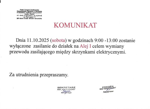W dniach 18.11-22.11.2021 zostaną do Działkowców dostarczone mailowo noty obciążeniowe dotyczące zużycia mediów z odczytu jesiennego oraz dopłat do opłat stałych. Działkowcy, którzy nie podali adresu e-mail, mogą odebrać noty osobiście w biurze Zarządu w poniedziałki i piątki w godzinach 15:00-17:00